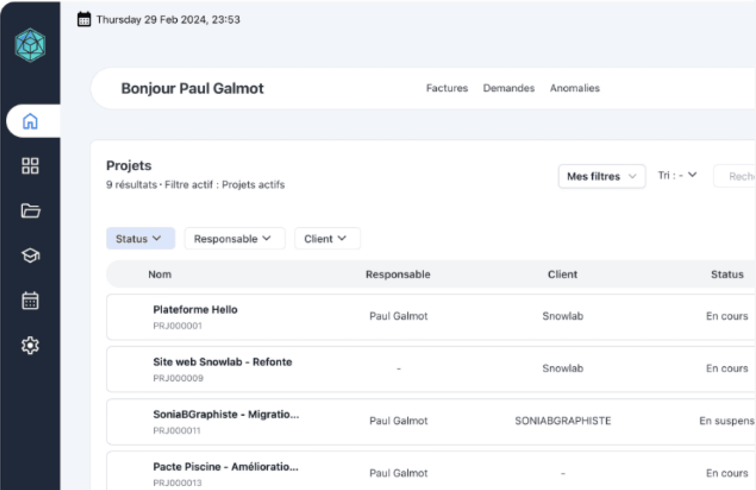 Bien plus d’un simple outil de gestion d’entreprise, la plateforme vous permet d’offrir à vos collaborateurs, vos clients ou vos partenaires, un espace leur permettant d’accéder à leurs informations.